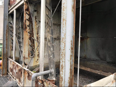 外殼的拆除還算簡單,都是用螺栓固定的,估計不到一個小時就能搞定。假如螺栓銹透了擰不開,大可用氧氣切割,不必心疼。外殼拆除后,納滿污垢的閉式冷卻塔盤管就顯露出來了,將其拆下,閉式冷卻塔的更換工作就完成了一半了。
