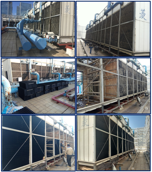 TCL總部大樓采購國內(nèi)知名品牌,冷卻塔總冷量為6000冷噸,原生產(chǎn)廠家已經(jīng)停止生產(chǎn)該款尺寸冷卻塔填料,管道多個部位均出現(xiàn)破裂漏水,我司排除專業(yè)技術(shù)團隊,在不停機狀況下完成整個升級改造,效果于新設備無異。